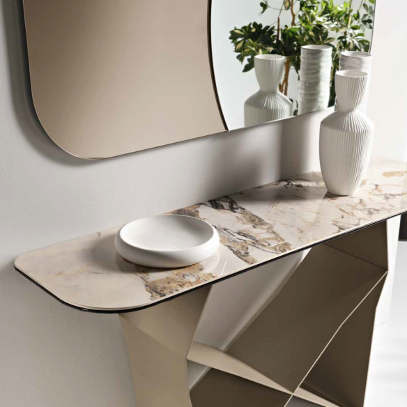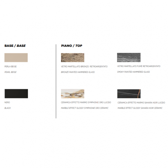 Console avec base en métal peint noir ou beige perle. Plateau en deux versions : verre martelé argenté au dos ou céramique effet marbre superposée sur verre.