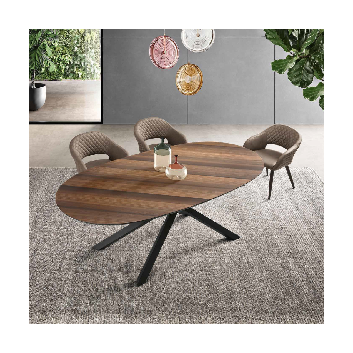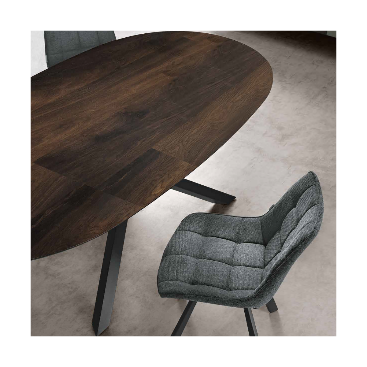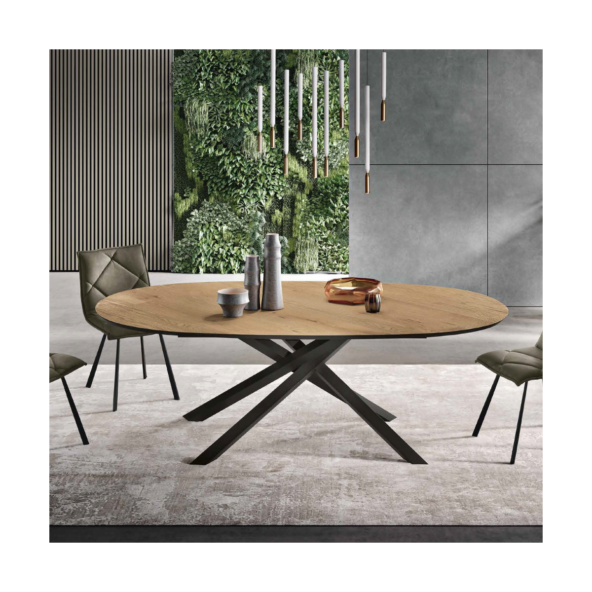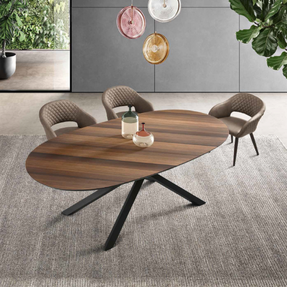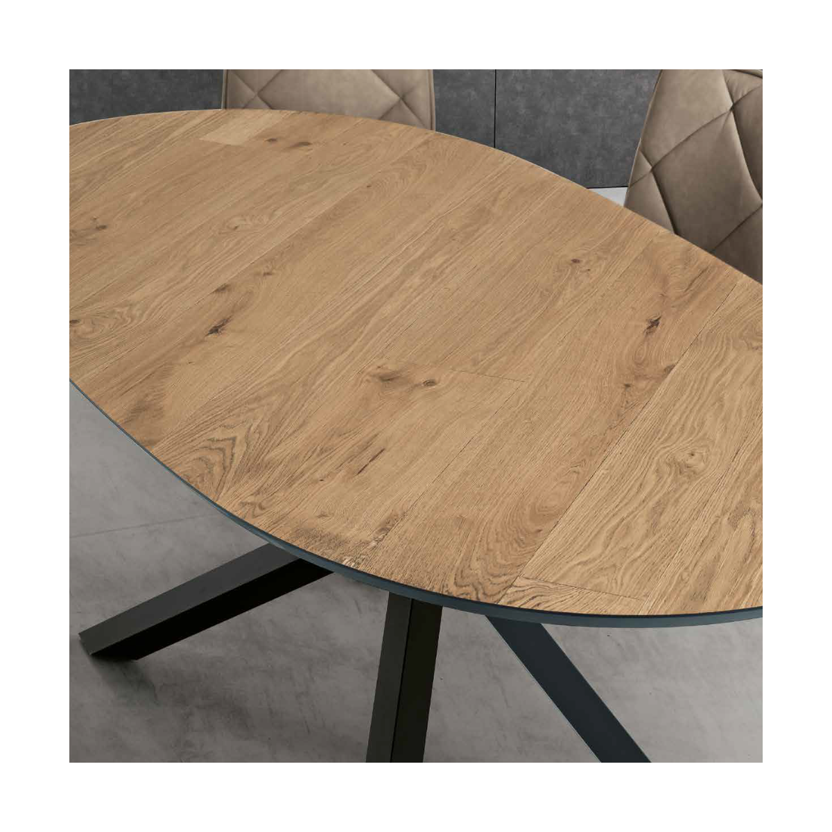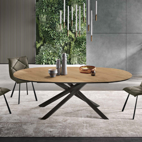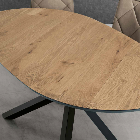 La table RON se distingue par sa base robuste en métal peint, qui garantit stabilité et durabilité dans le temps. Le plateau ovale en placage de chêne donne à la table un aspect naturel et sophistiqué, parfait pour les environnements modernes et traditionnels.