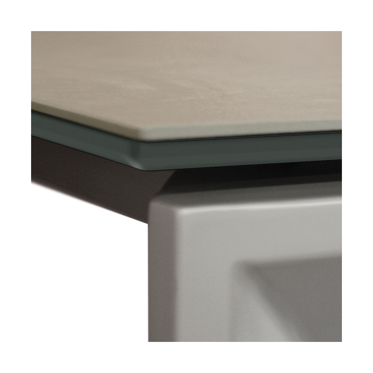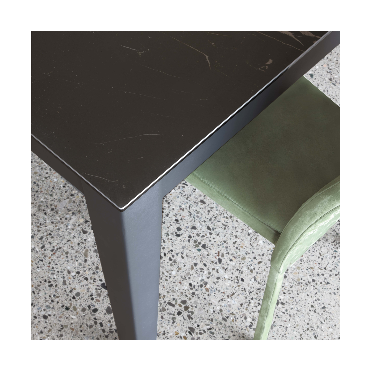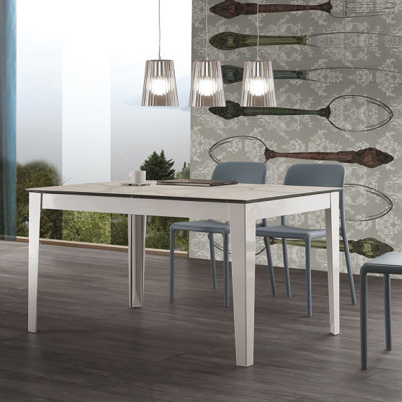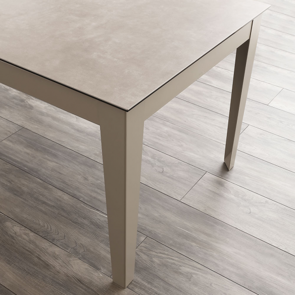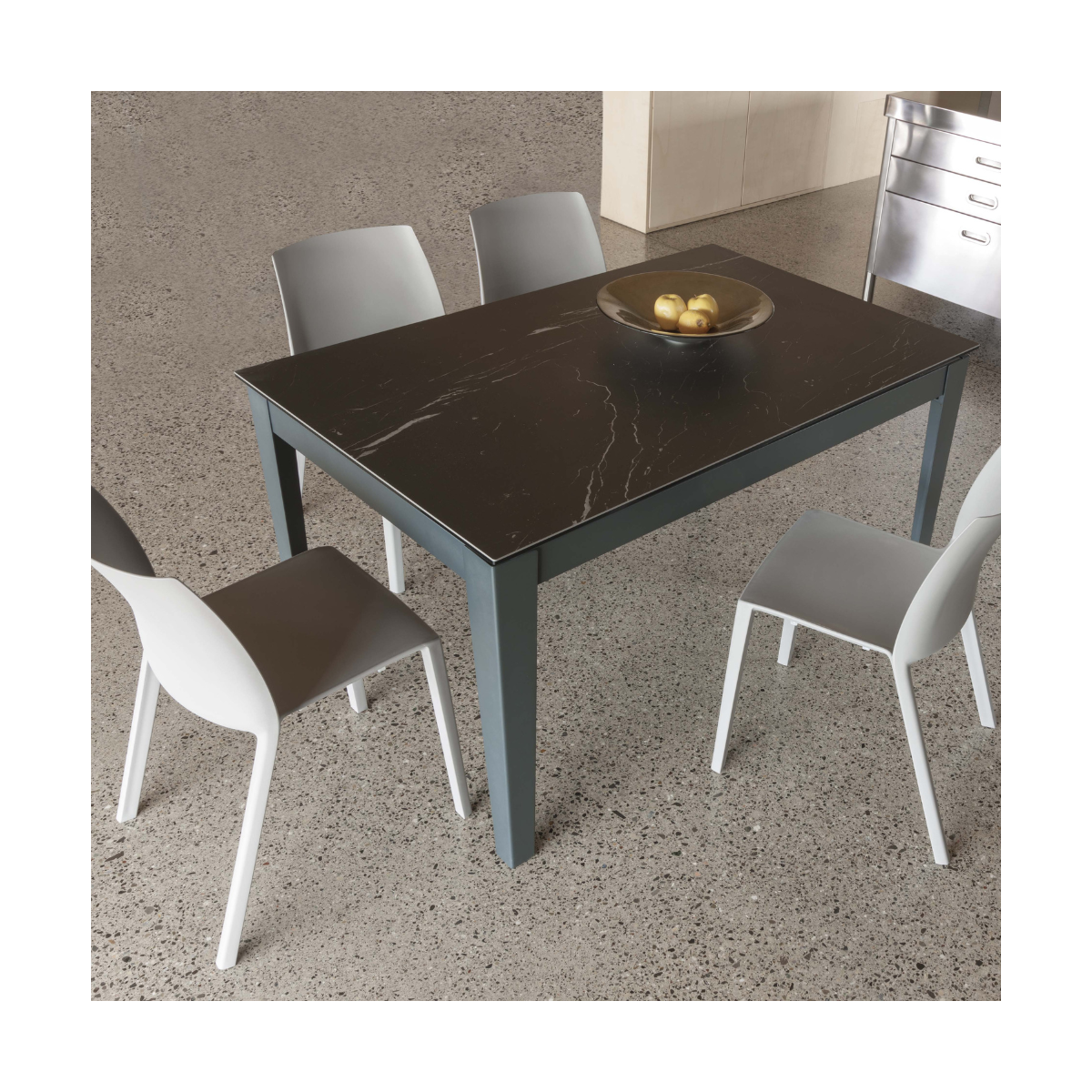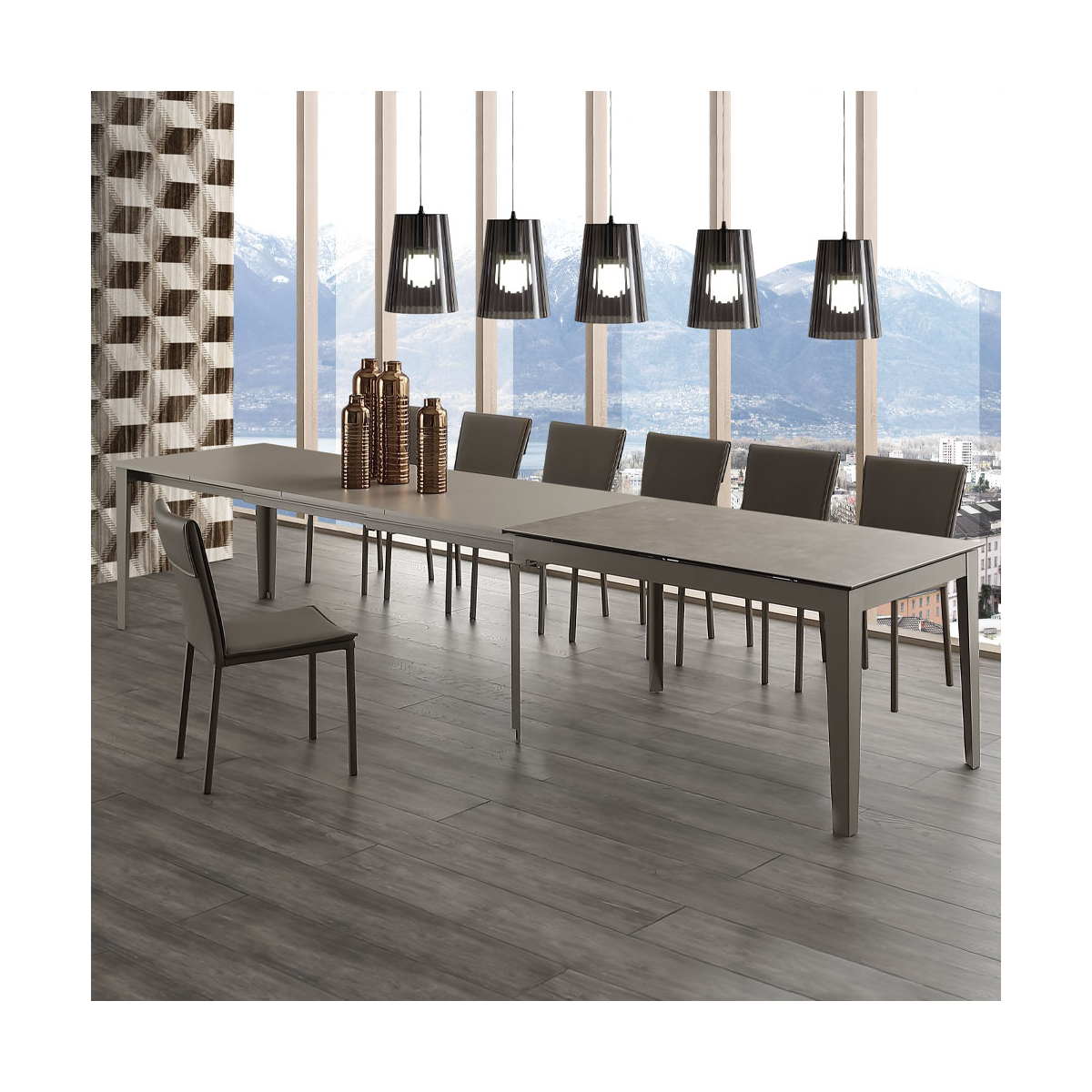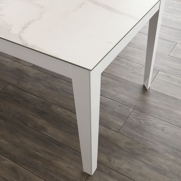 Le plateau en vitrocéramique de 3+8 mm d'épaisseur est disponible en différentes finitions, notamment Black Stone Soft Touch, Tortora Fango et Marmo Bianco. Ce matériau est extrêmement pratique et résistant, capable de résister aux coupures, aux incisions et aux températures élevées, ce qui le rend idéal pour un usage quotidien. La structure en métal peint garantit solidité et stabilité à la table, tandis que les rallonges en mélamine assurent une extension facile et sûre.
