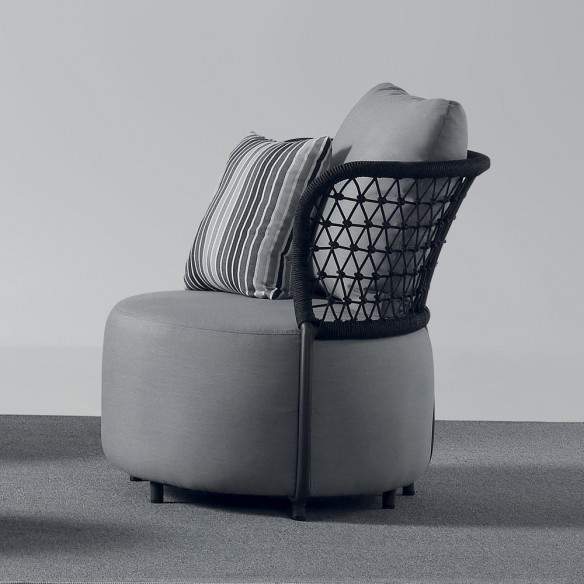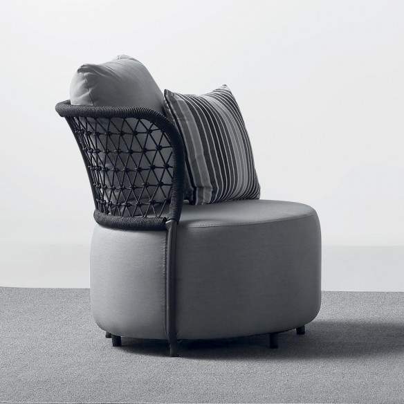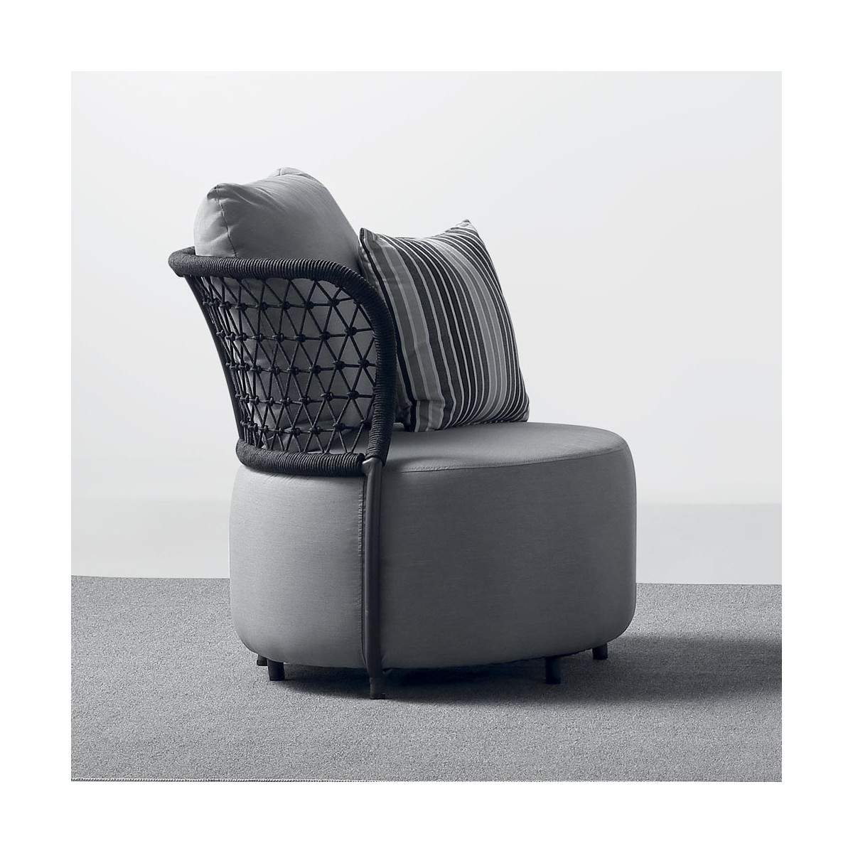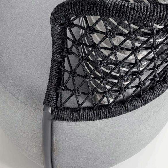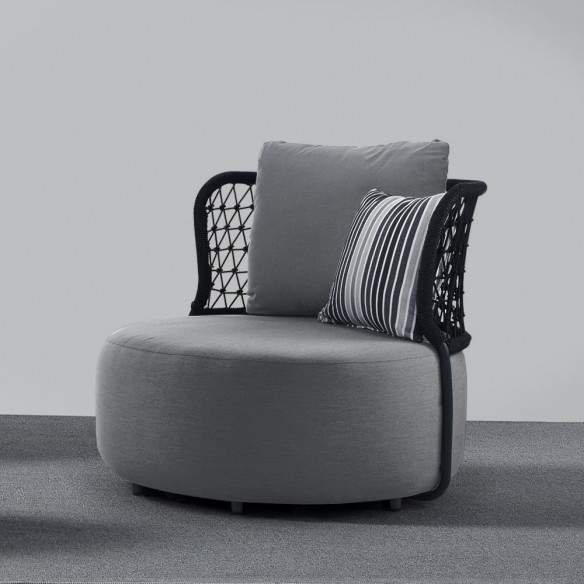L'ensemble est complété par les coussins en caoutchouc d'extérieur imperméable de couleur grise et à motifs rayés, qui ajoutent une touche d'élégance et de confort au fauteuil.