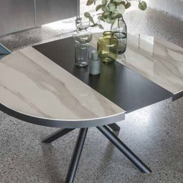 Table extensible MARTE avec structure en métal peint en noir et plateau en céramique.