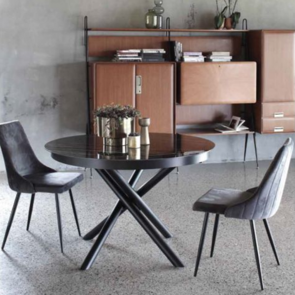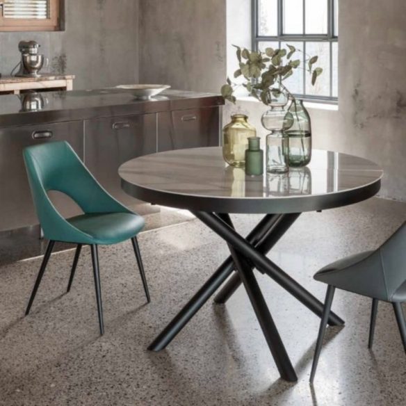 Venez découvrir la sublime table ronde extensible Marte de la célèbre maison La Seggiola, un authentique bijou pour votre maison. Avec sa structure en acier peint en noir et son luxueux plateau en céramique brillante Florim, disponible dans les finitions exclusives or calacatta brillant ou nuit tonnerre brillante , cette table est une véritable œuvre d'art.
