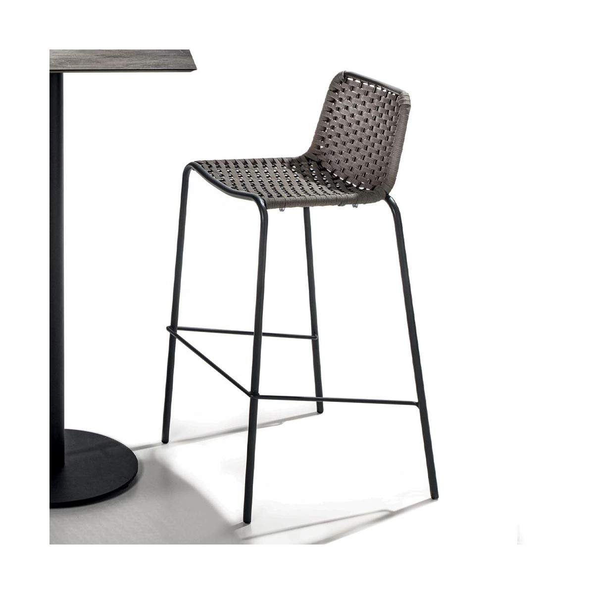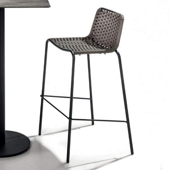 Tabouret Café De Paris 1823/17 La Chaise est un meuble confortable réalisé avec une structure en métal galvanisé de couleur anthracite. Il se caractérise par son dossier fin réalisé avec un tissage de cordes en finition gris tourterelle.