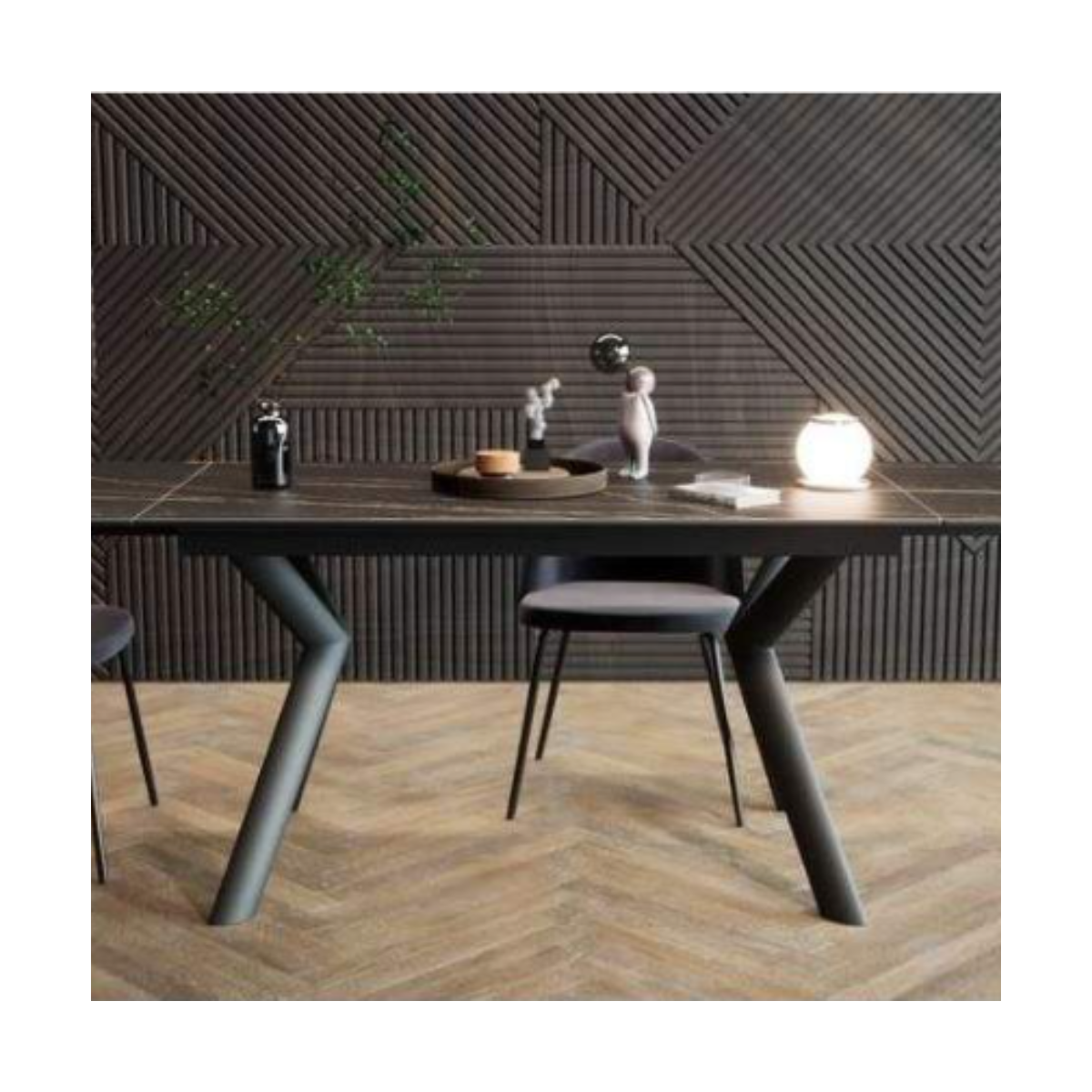 The base, made of painted metal , gives stability and character to the table, enhancing the contrast with the surface of the top, available in different marble or stone effect fi nishes , for a very classy aesthetic impact. The extension mechanism is designed to guarantee maximum practicality: with a simple gesture, the structure extends harmoniously , offering more space to welcome guests and make every occasion special.