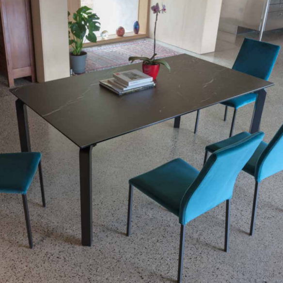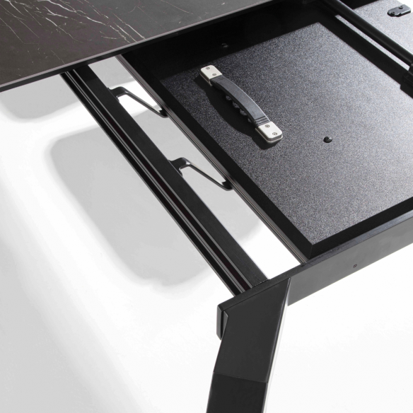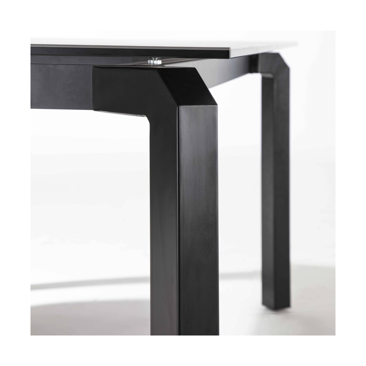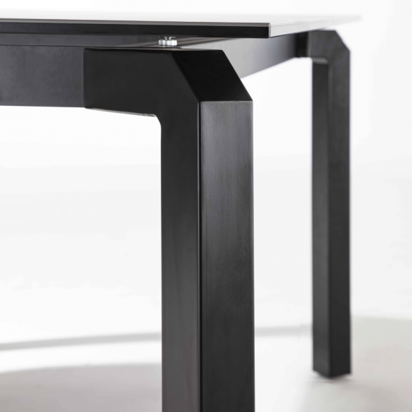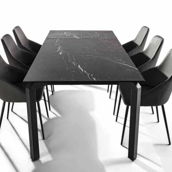 Table extensible ATLANTE avec structure en métal peint en noir et plateau en céramique.