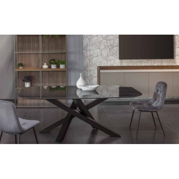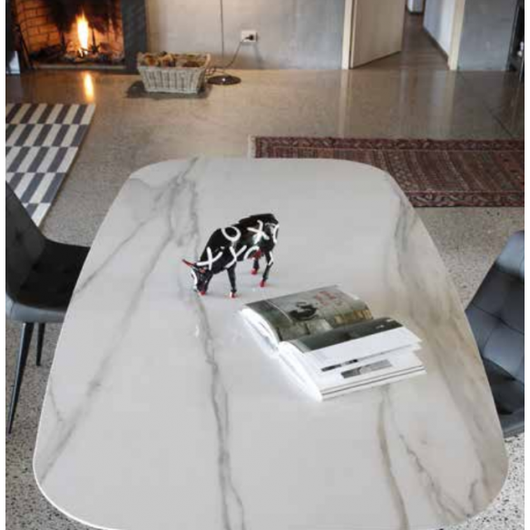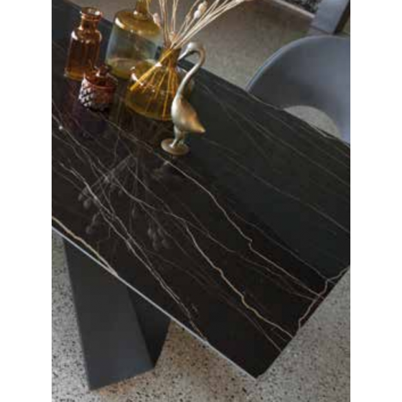 Le plateau de la table est en céramique brillante FLORIM, un matériau de très haute qualité qui donne un aspect élégant et durable. Le choix de la céramique garantit non seulement un design sophistiqué, mais assure également résistance et facilité d'entretien.