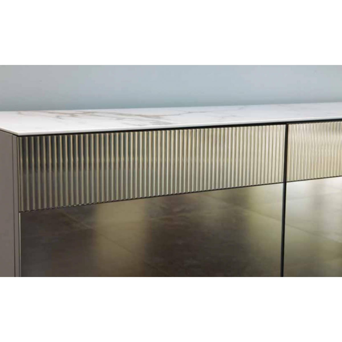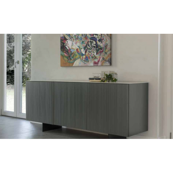De plus, le buffet est équipé de verres striés texturés gravés à l'acide dans les versions fumée ou bronze, créant un contraste harmonieux avec les autres surfaces. L'attention portée aux détails et la qualité des matériaux en font un choix idéal pour ceux qui souhaitent un mobilier élégant pour leur maison.