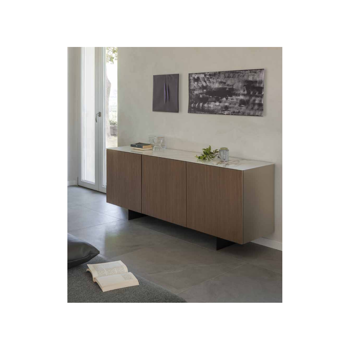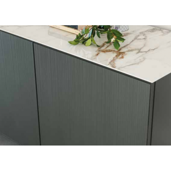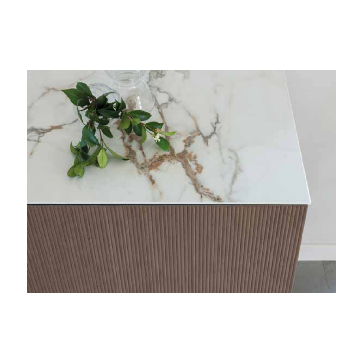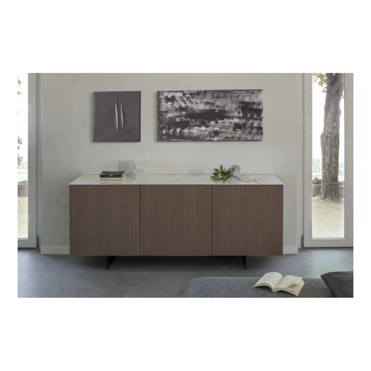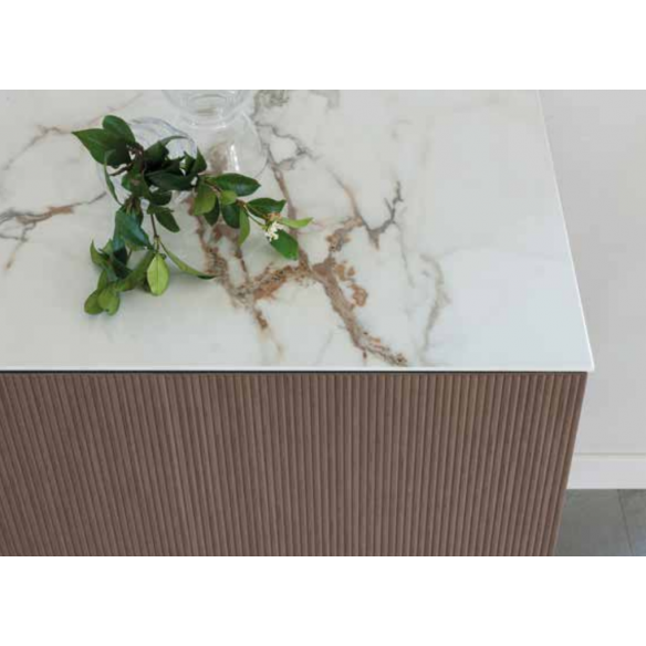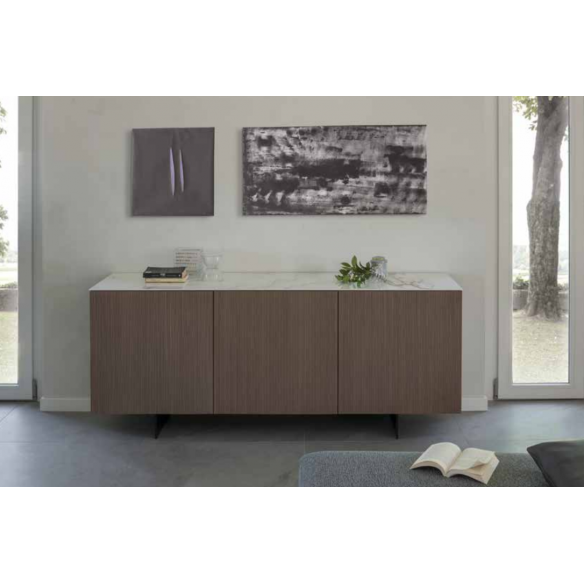 Le buffet Trinity de La Seggiola est un meuble au design raffiné et aux finitions soignées. Doté d'une base en acier peint en noir et d'une structure disponible dans des tons élégants anthracite ou sable, ce buffet est doté de portes en noyer massif cannelé avec une teinte naturelle. Son style est encore enrichi par des détails en miroir fumé ou bronze et un plateau en céramique brillante dans les variantes or blanc Calacatta ou noir Thunder Night, qui confèrent au buffet un aspect élégant et contemporain.